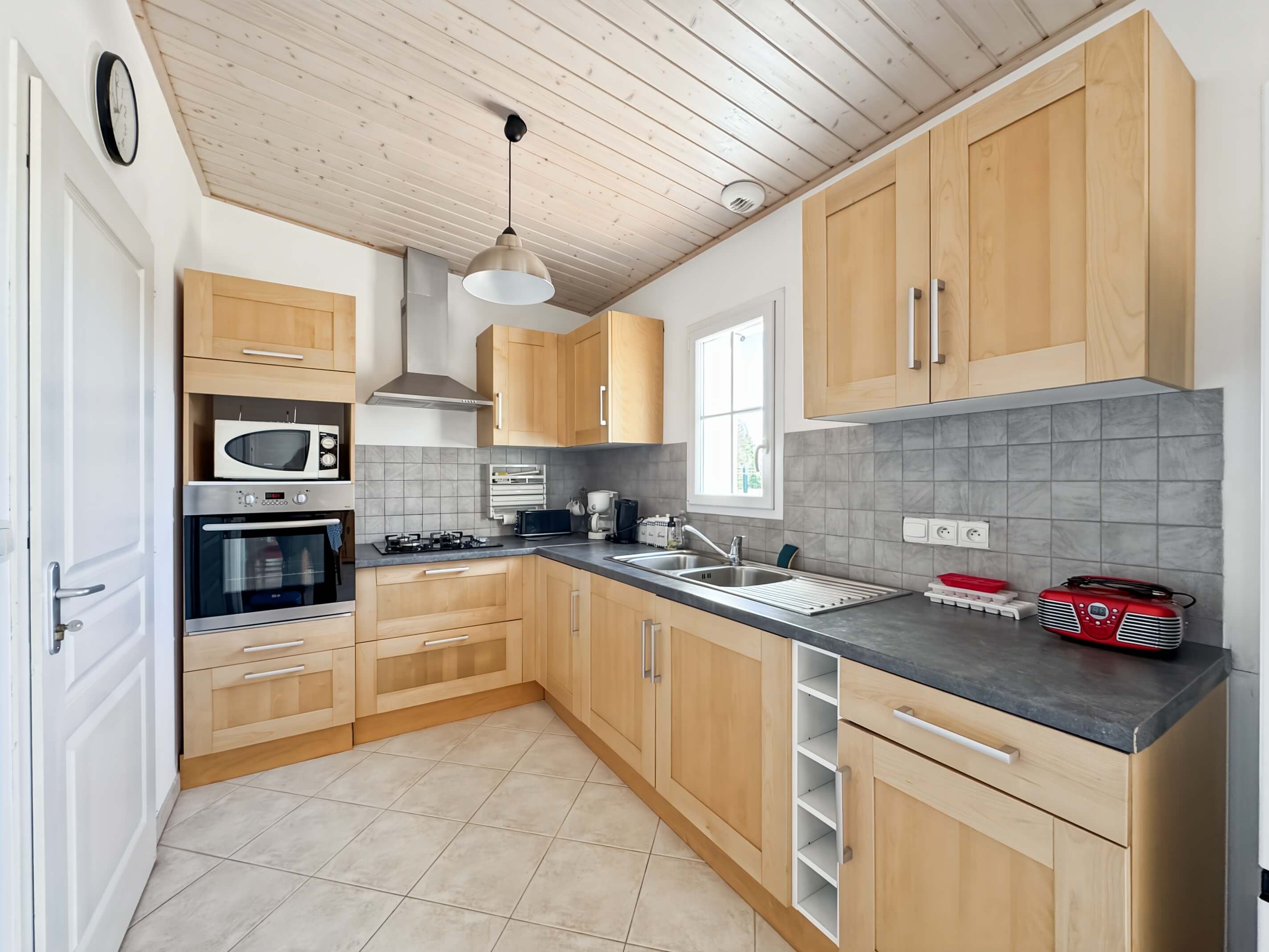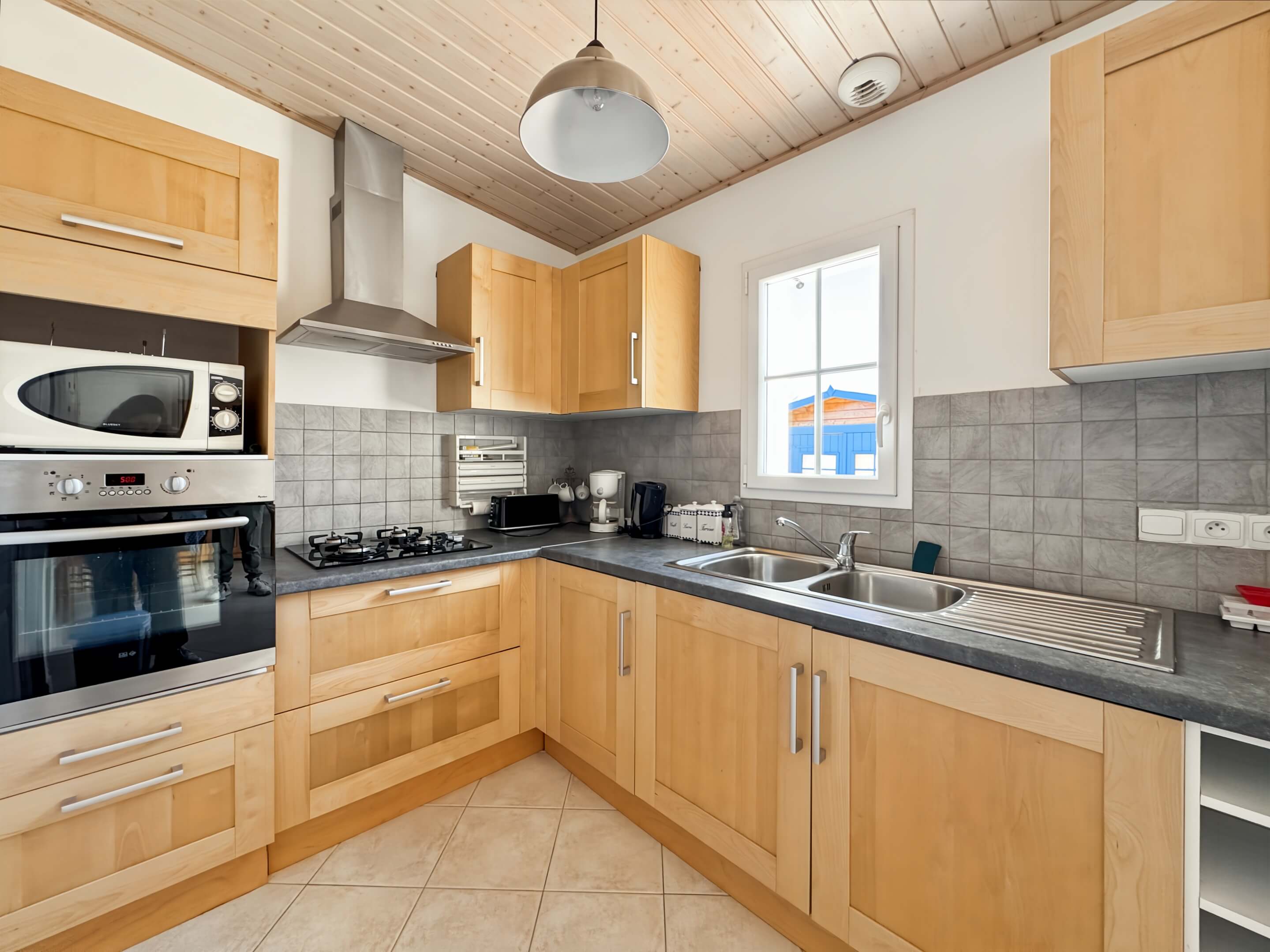 - un grand salon-séjour avec cuisine ouverte, équipée et aménagée: 4 feux gaz + hotte, un four électrique, un micro-ondes, un grand frigo-congélateur.