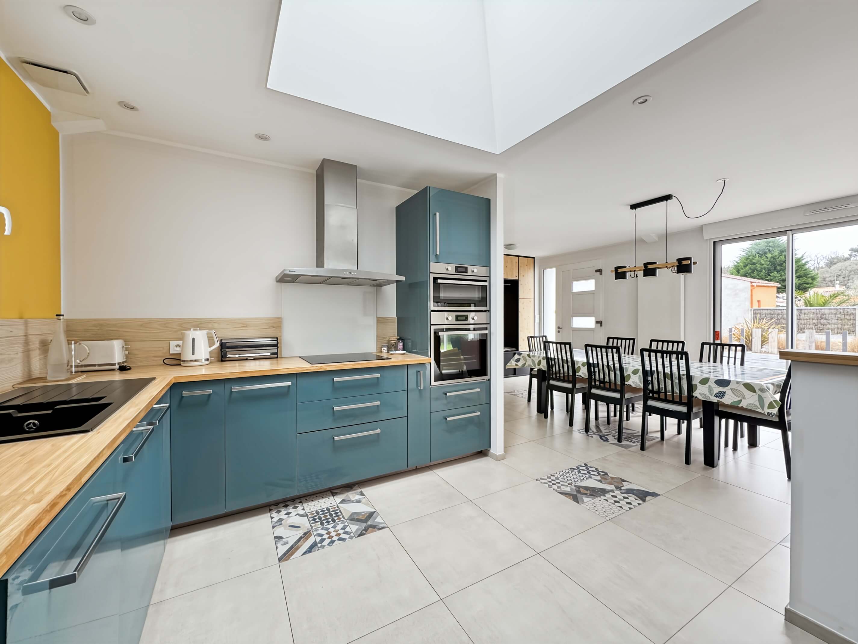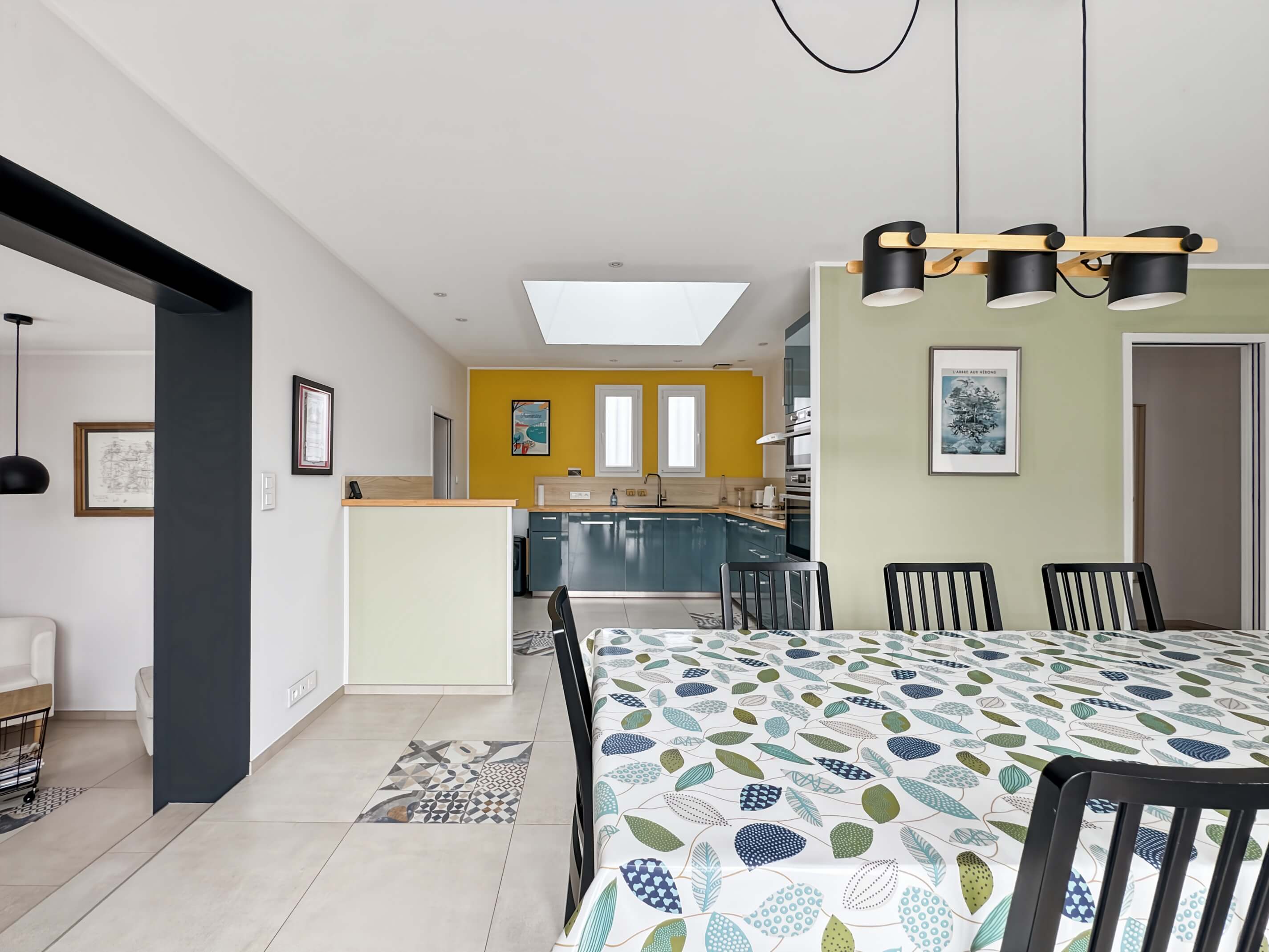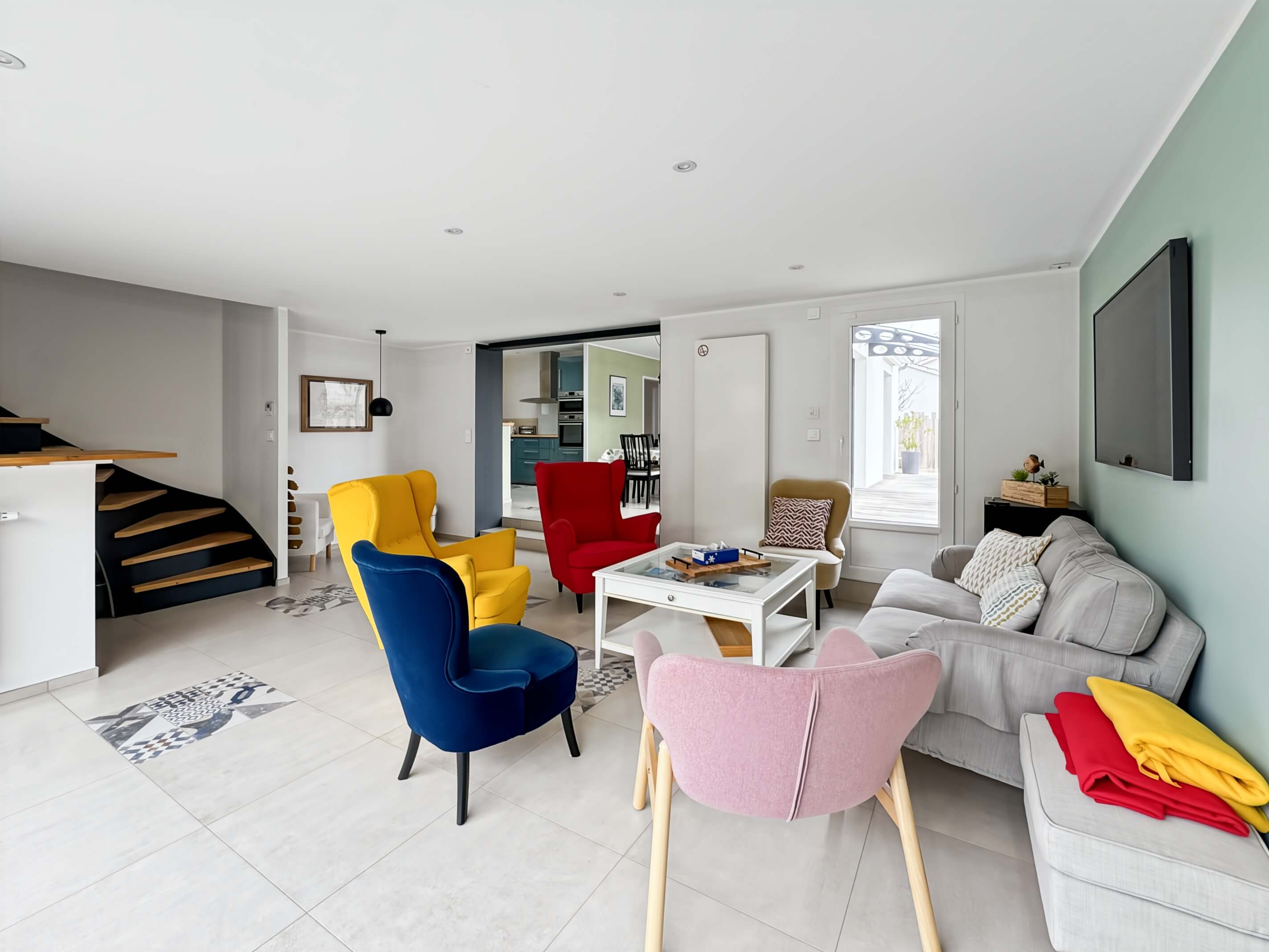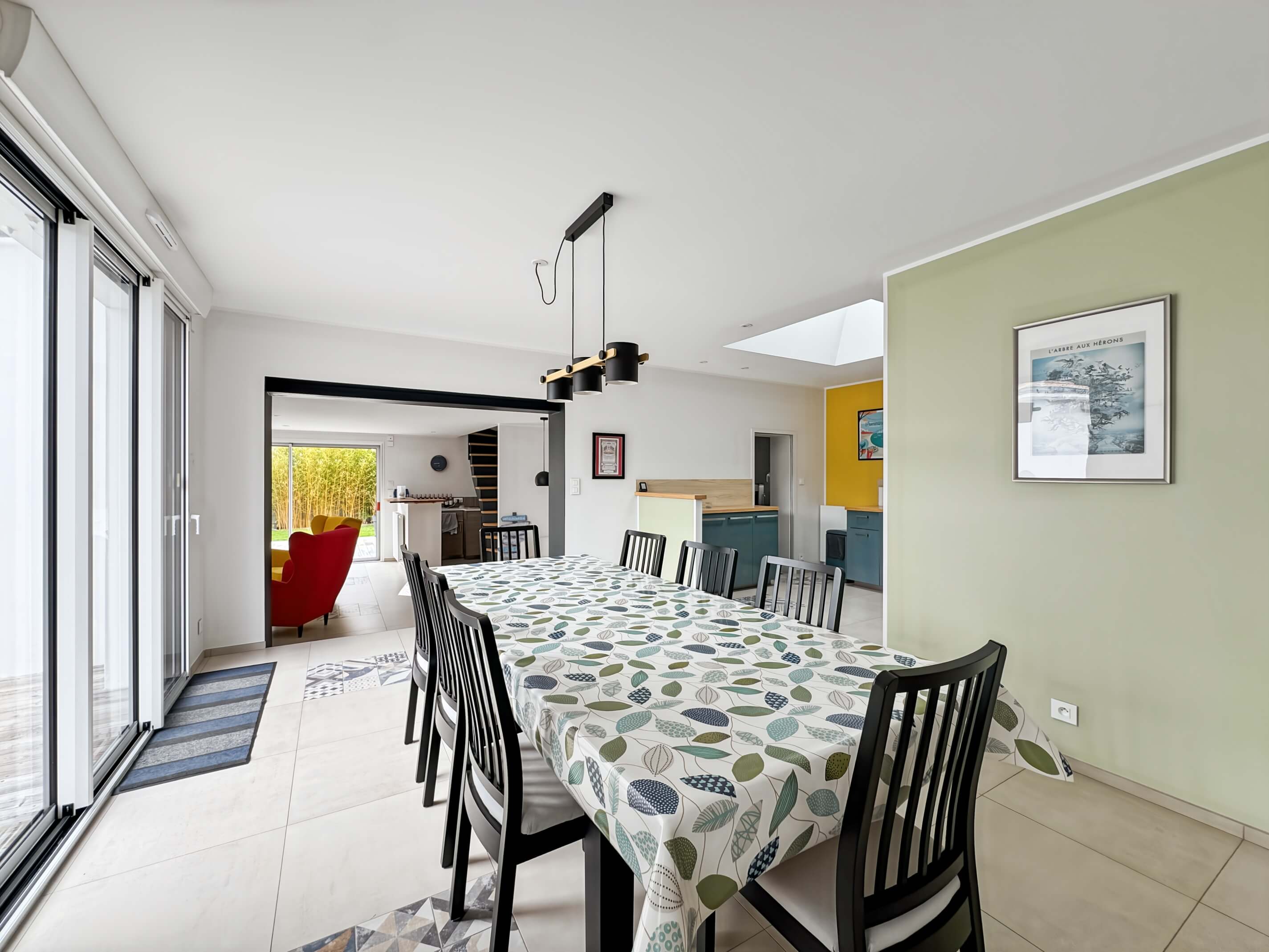 - un séjour avec table et chaises, cuisine ouverte avec puits de lumière, aménagée et équipée .