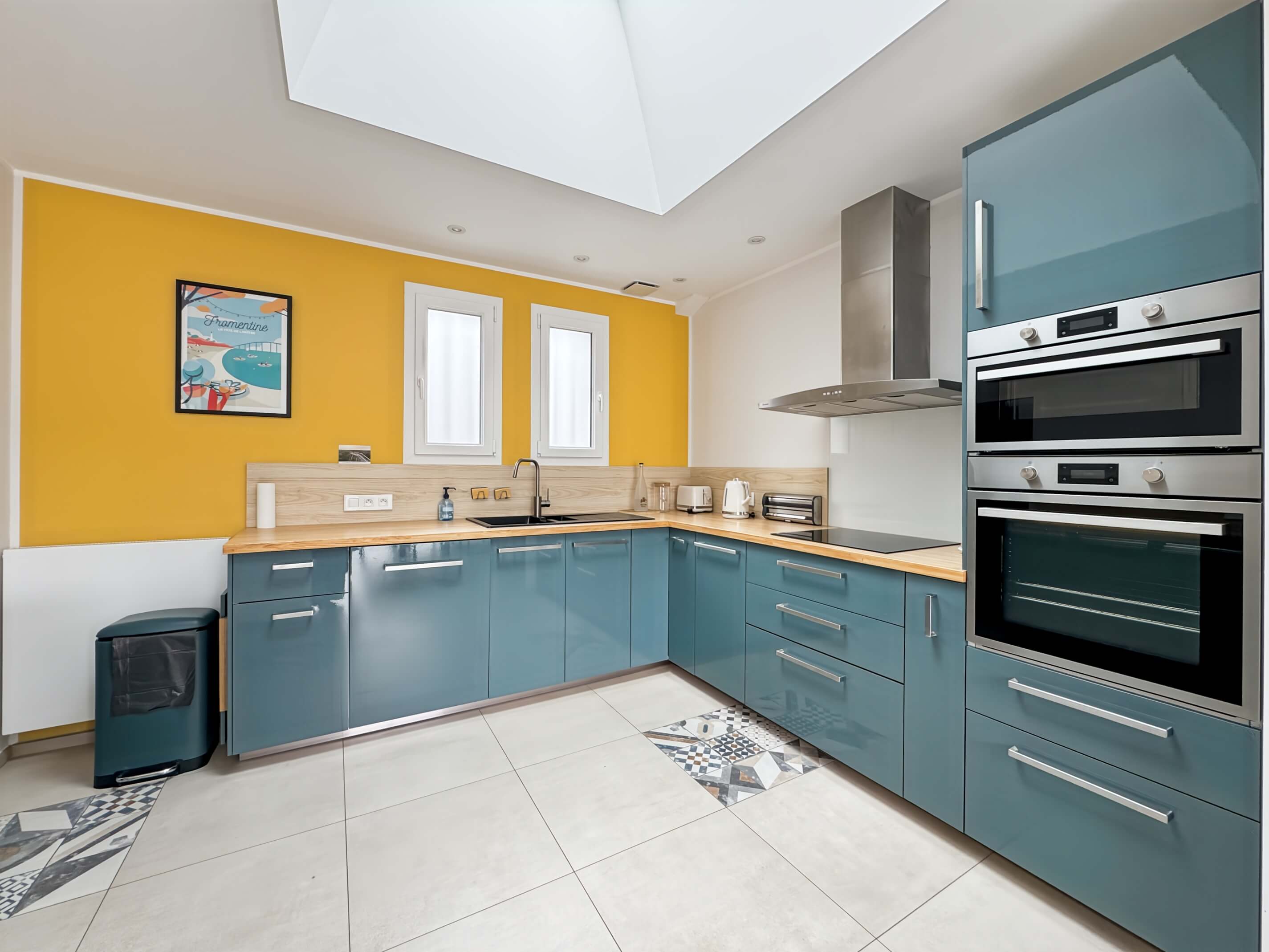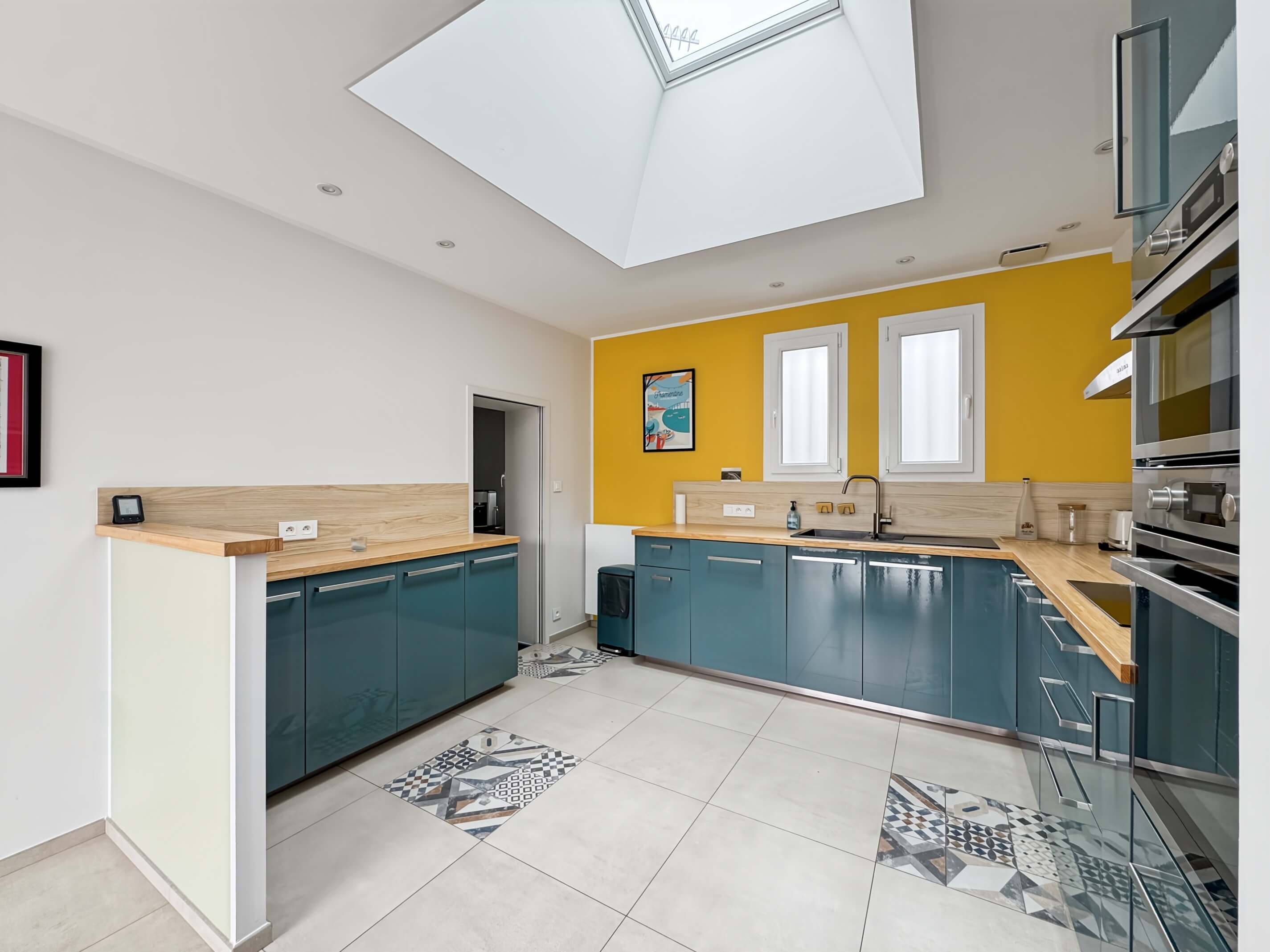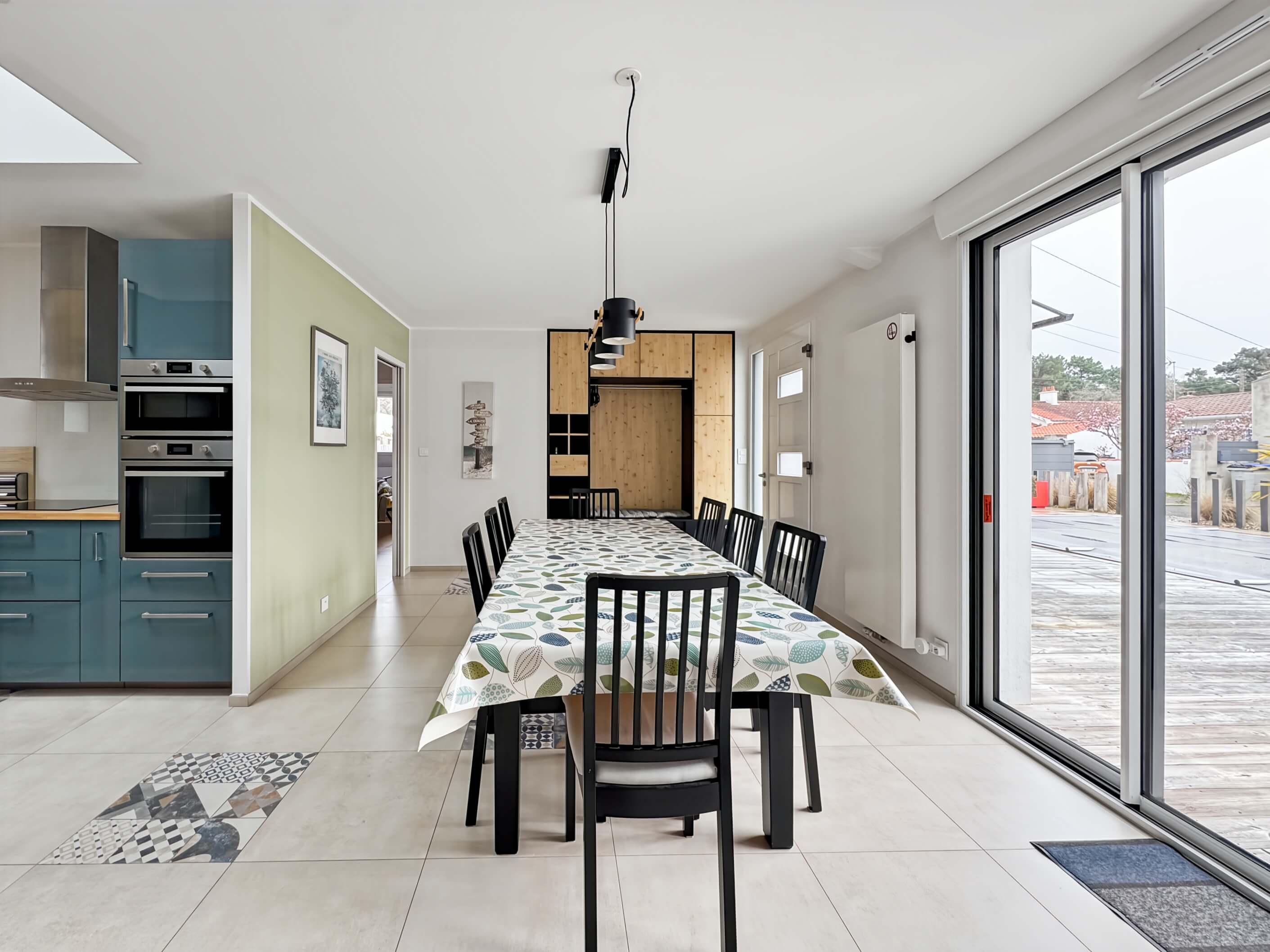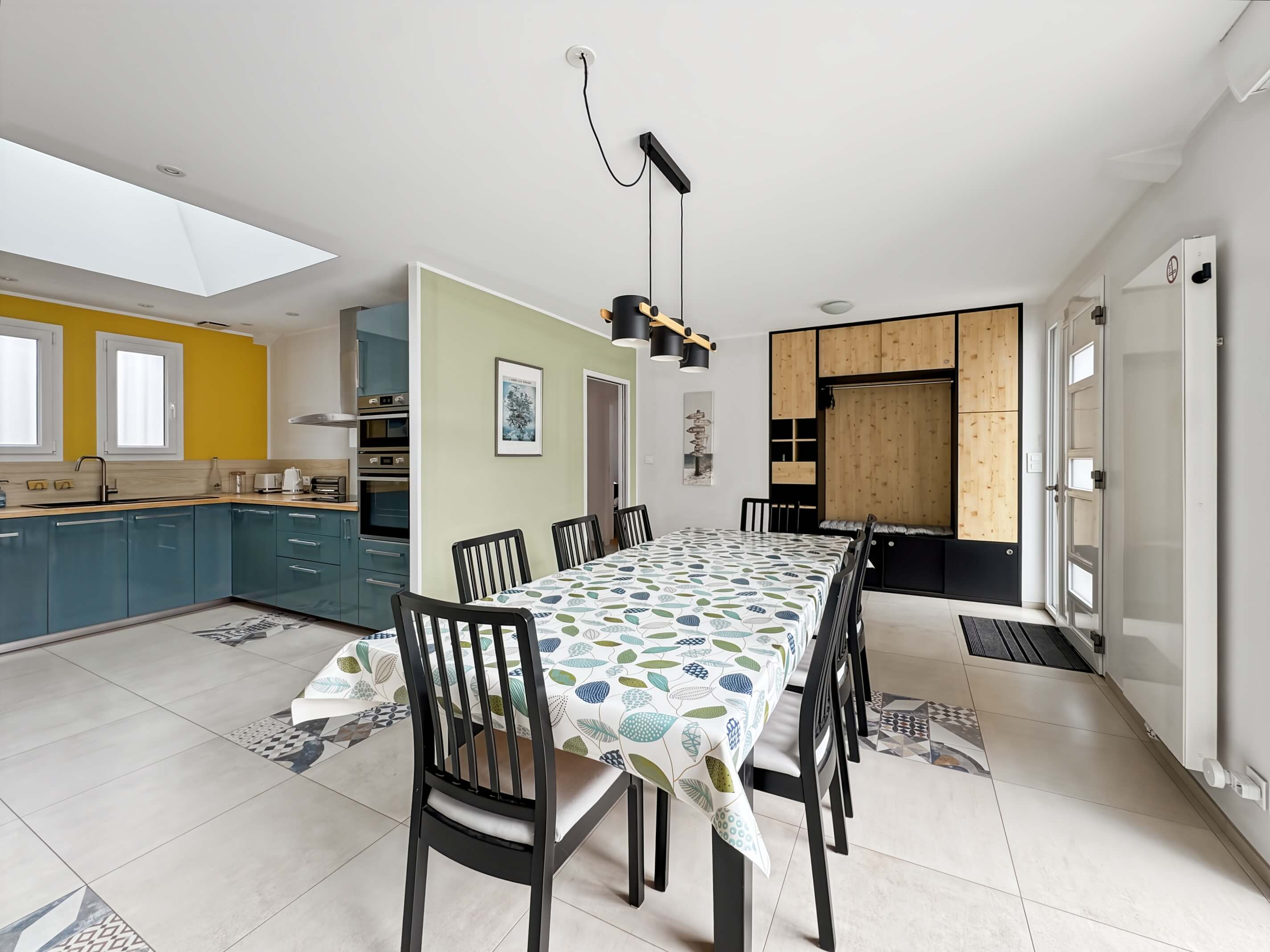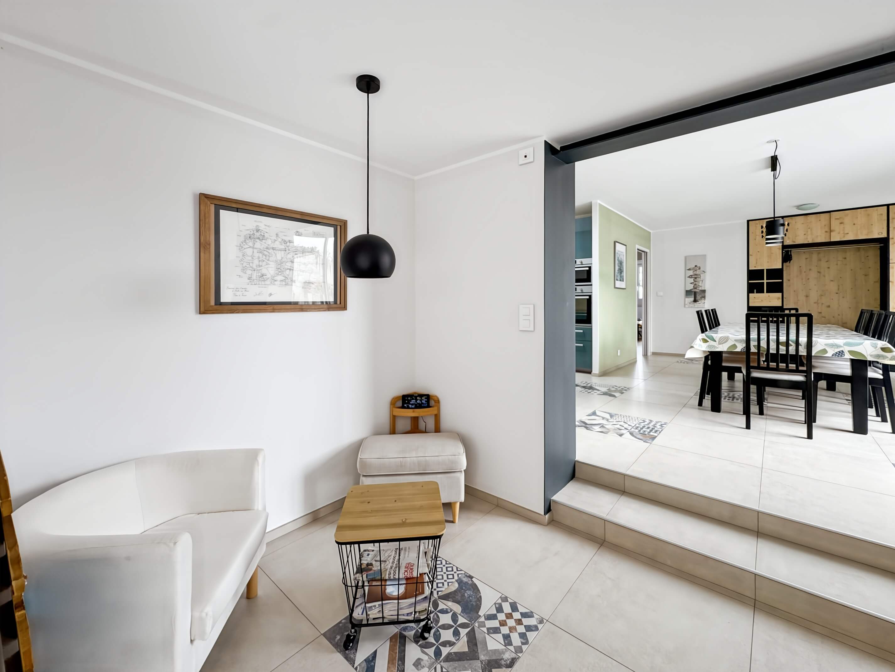 - un séjour avec table et chaises, cuisine ouverte avec puits de lumière, aménagée et équipée .
