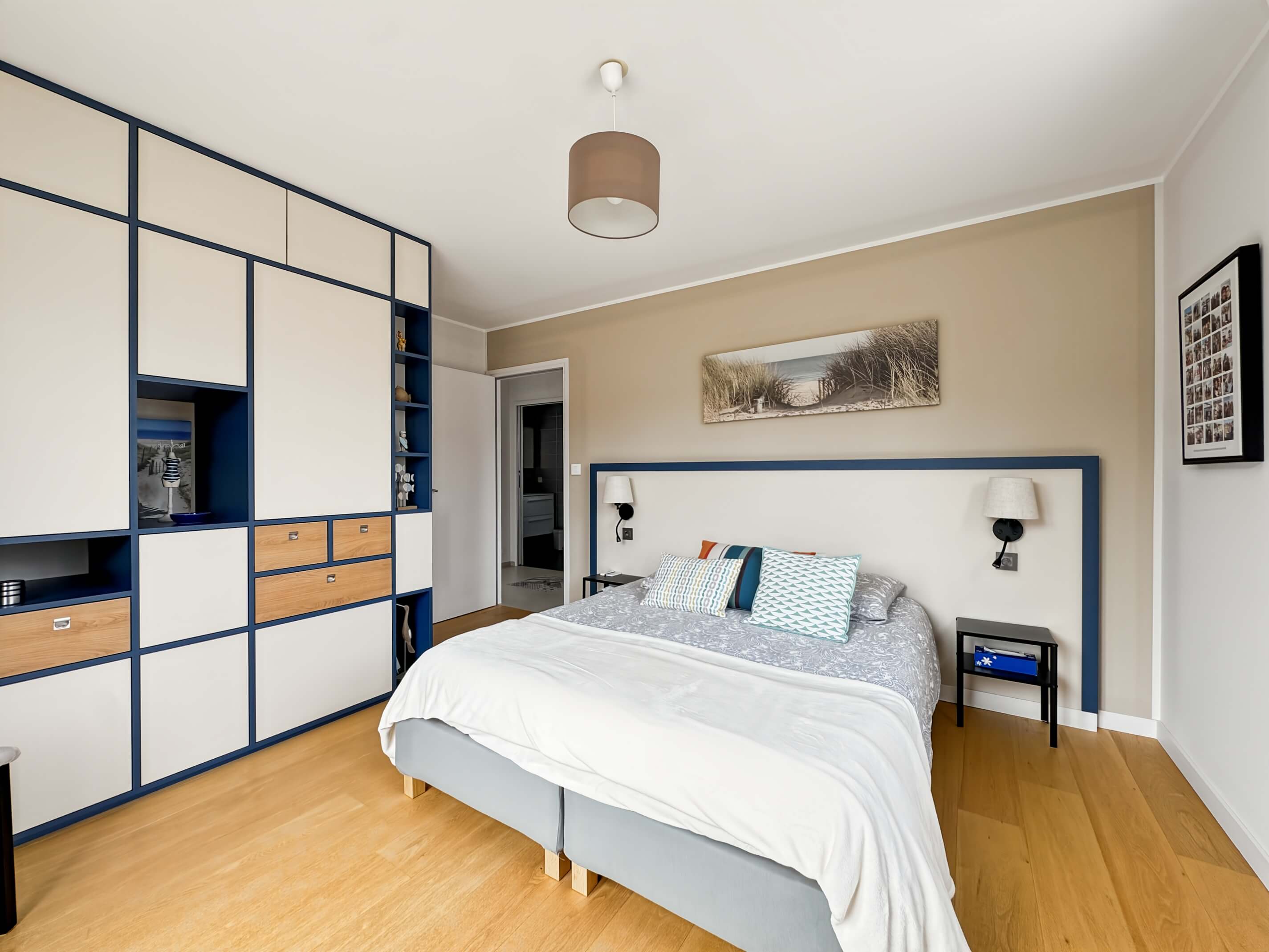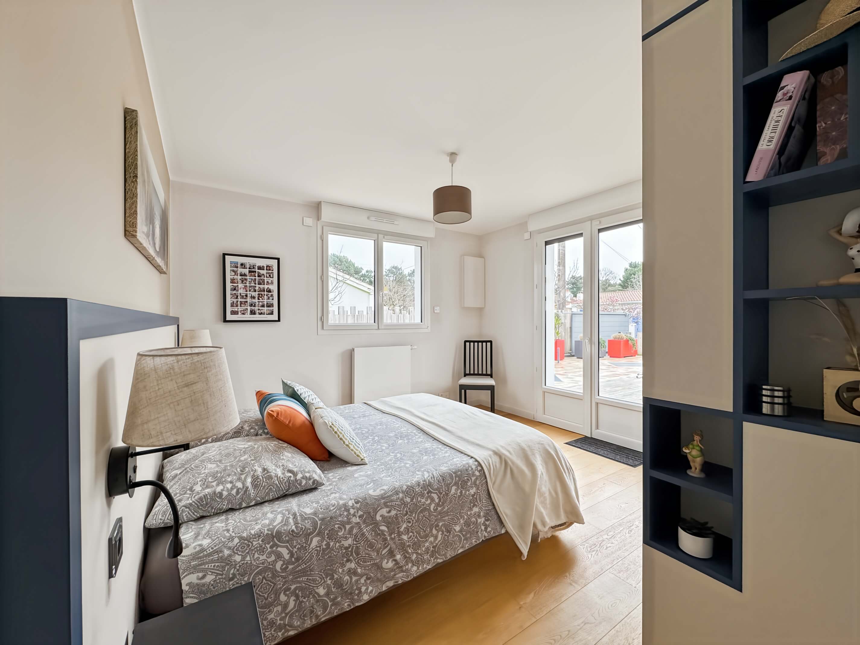 - chambre 1, avec 1 lit de 160, penderie, 2 chevets + lampes .