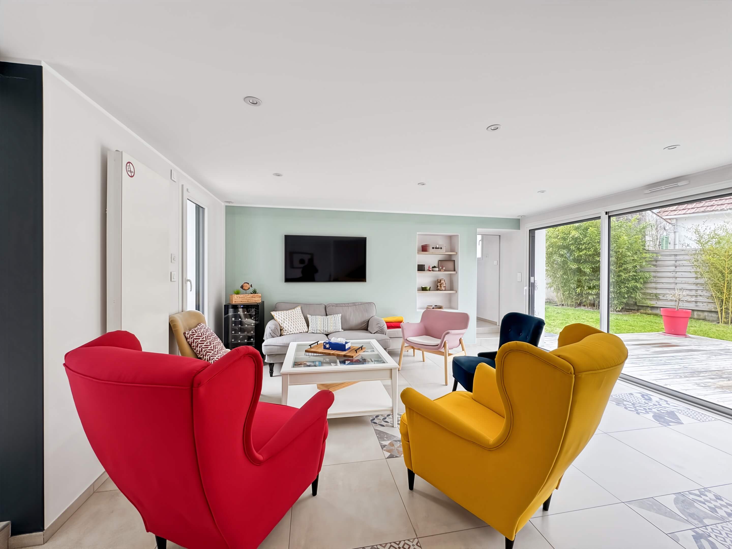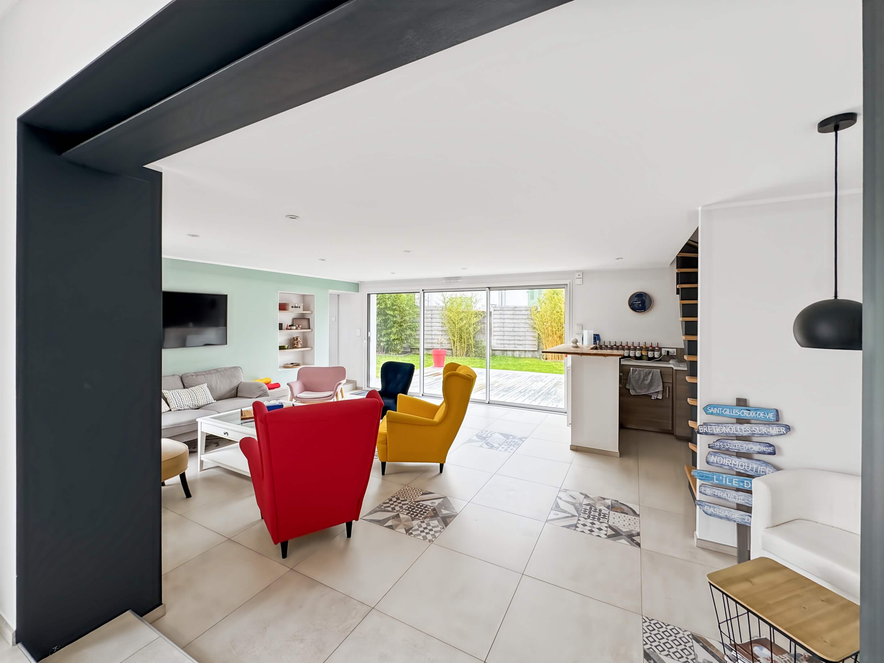 - un salon, avec canapé et fauteuils, table basse, TV,