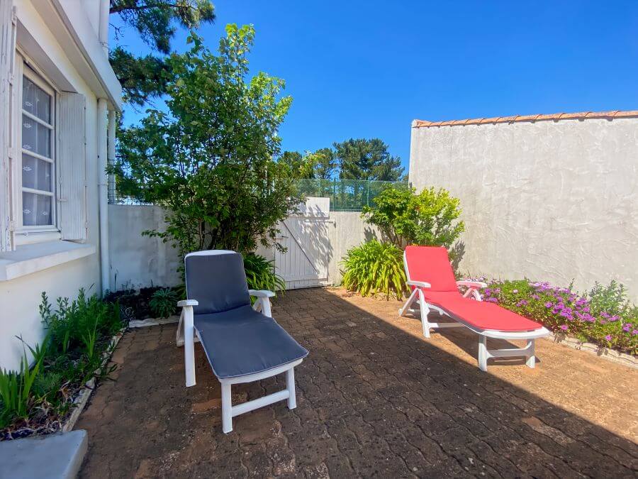 - un salon de jardin et deux bains de soleil dans une cour clôturée fermée.