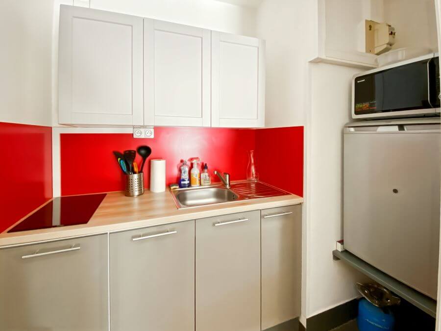 - d'une kitchenette avec 1 plaque vitrocéramique, 1 réfrigérateur, 1 cafetière, 1 grille pain et 1 micro-ondes