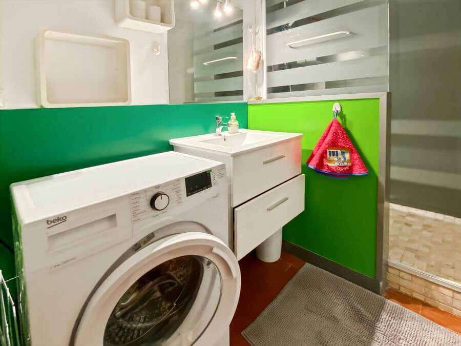 - d'une salle d’eau avec douche, meuble vasque, miroir et lave linge